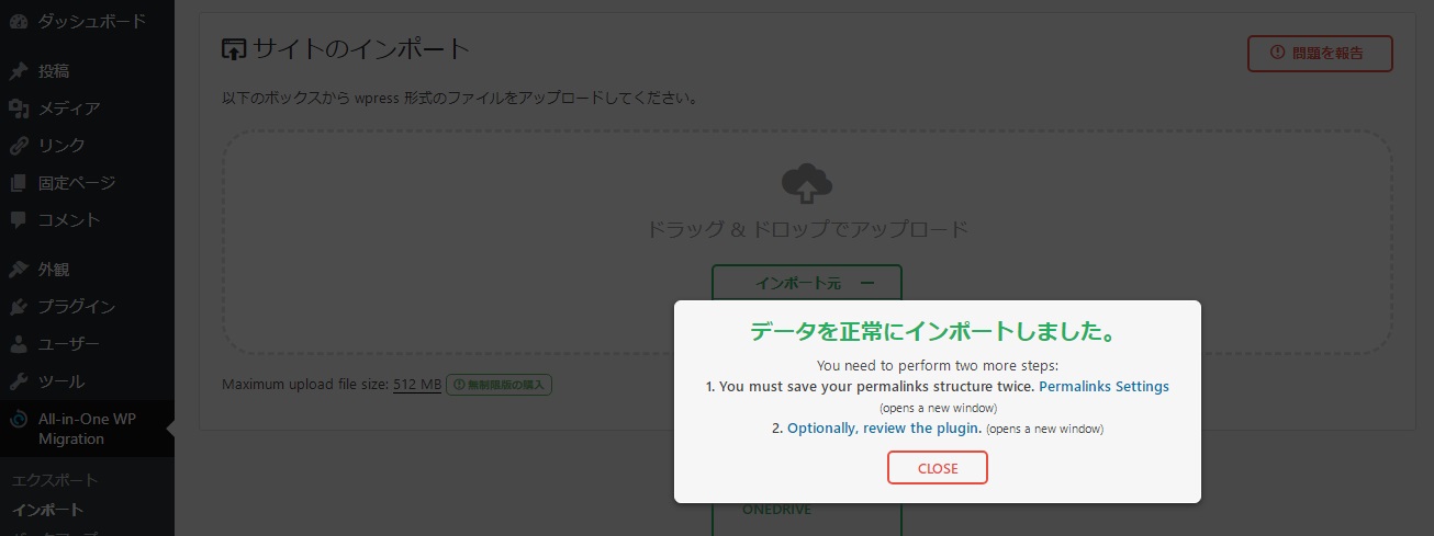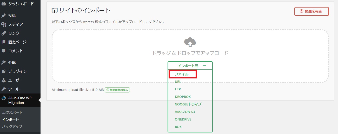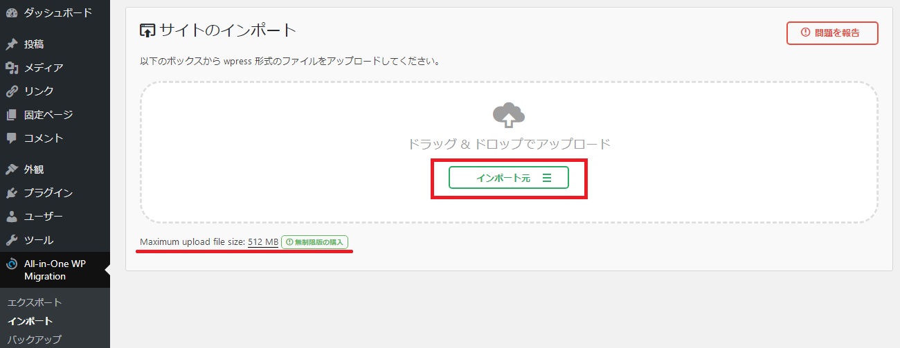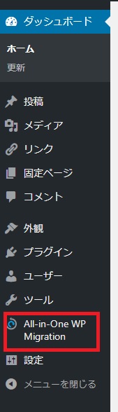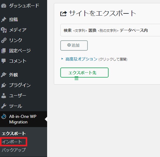 さっきと同じで、メニューにAll-in-One WP Migrationが出るので、クリックして今度はエクスポートではないので、インポートをクリック。