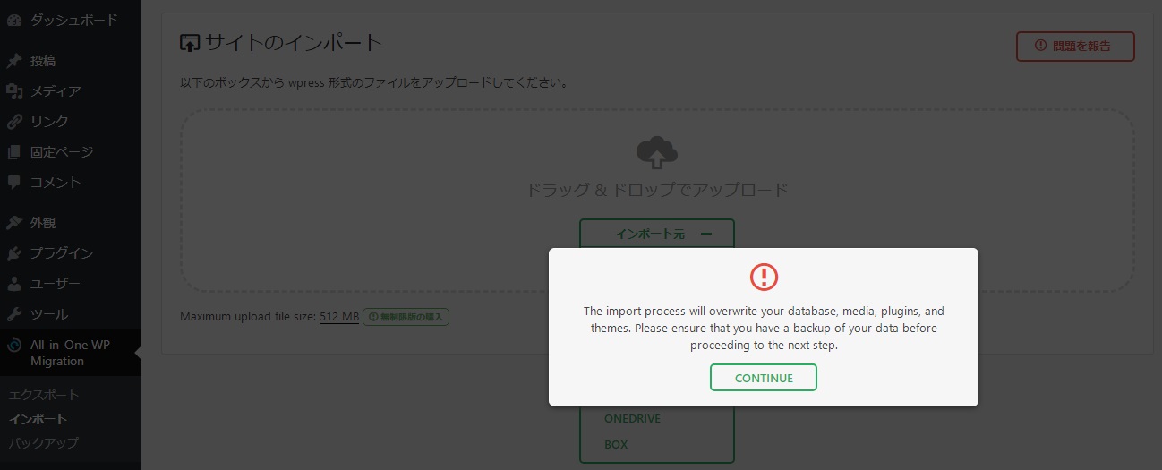 これは、インポートすると、データベース、メディア、プラグイン、テーマを上書きするから、次の手順に進む前に、データのバックアップがあることを確認してください、という内容。