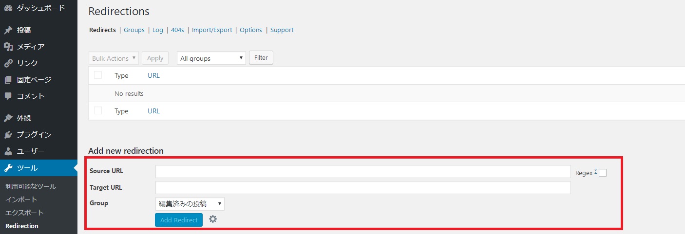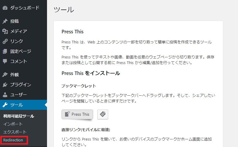 プラグインの新規追加からRedirection をインストールします。