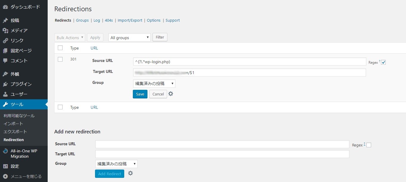 まず、最初の入力は、リダイレクトをすべてのURLで有効にすると、移転元のワードプレスにログインしようとしても、すぐに転送されてしまいログインできなくなってしまいます。